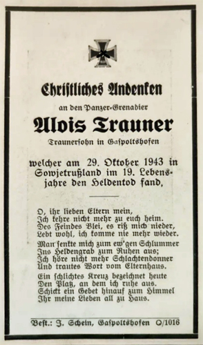 Panzer-Grenadier | TRAUNER | Alois | 08.03.1925 Gaspoltshofen | 29.10.1943 Rußland, 150 m südw. Bolschaja‑Awranowka | Grab derzeit noch in: Golowkowka / Kirowograd - Ukraine |