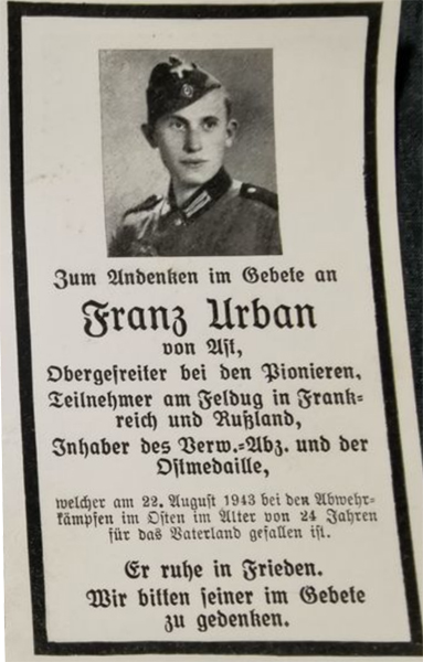 Obergefreiter | URBAN | Franz | 06.10.1919 Waldmünchen | 22.08.1943 im Osten, Olschany | Pioniere SS-Pz. Gren. Regt. "Deutschland", 6.Komp. |