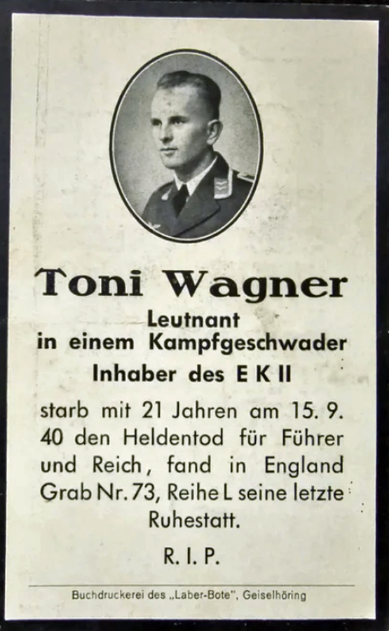 Leutnant | WAGNER | Toni | 27.01.1919 Waltendorf | 15.09.1940 Feindflug gegen England | 9. Kampfgeschwader 76, III. Gruppe | Kriegsgräberstätte in Cannock Chase: Block 1 Reihe 5 Grab 142, WAGNER Anton |