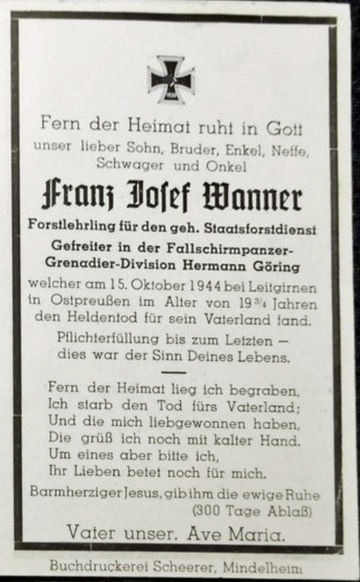 Gefreiter | WANNER | Franz Josef | 15.10.1944 bei Leitgirnen, Ostpreußen | Fallschirmpanzer Grenadier‑Division Hermann Göring | 19 ½ Jahre |