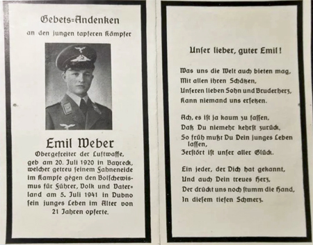 Obergefreiter | WEBER | Emil | 20.07.1920 Bayreck | 05.07.1941 südl. Dubno | Luftwaffe, Jagdgeschwader 53 Stabs Komp. | Grab derzeit noch in: Nosowica Stara / Polytsch - Ukraine |