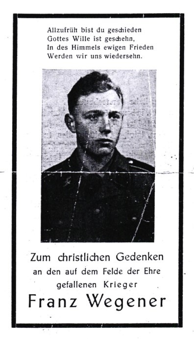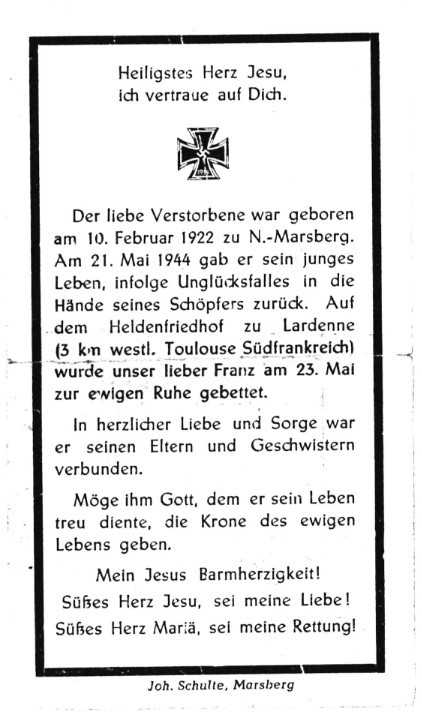 | WEGENER | Franz | 10.02.1922 Niedermarsberg | 21.05.1944 Lardenne, Frankreich |