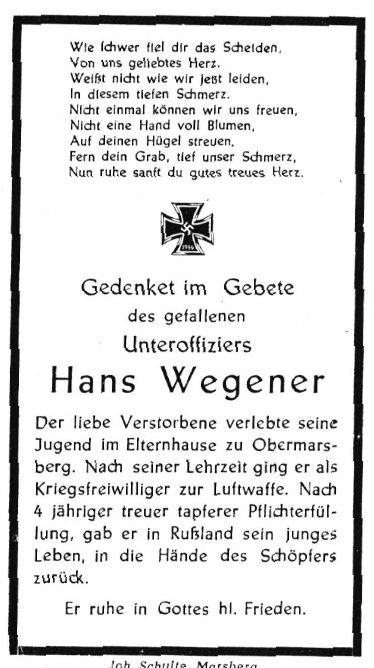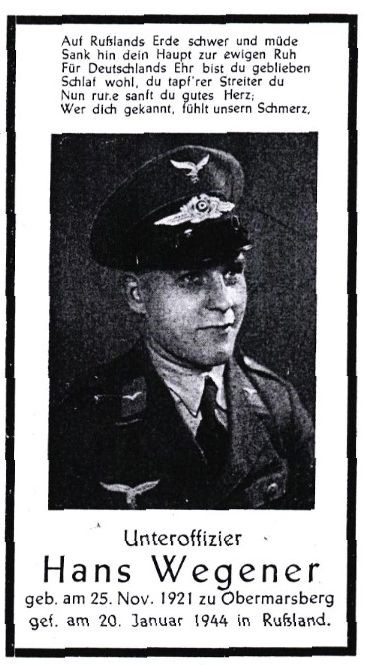 | Unteroff | WEGENER | Hans | 25.11.1921 Obermarsberg | 20.01.1944 Rußland |