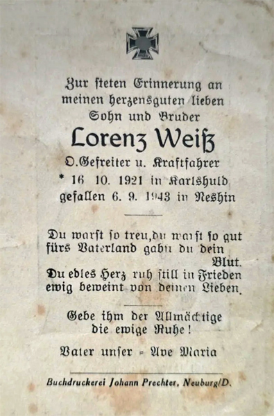 Obergefreiter und Kraftfahrer | WEIß | Lorenz | 16.10.1921 Karlshuld | 06.09.1943 Neshin | Fliegerhorst Komp. A 202/VII |