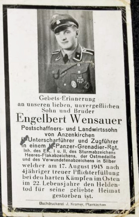 SS‑Unterscharführer, Zugführer | WENSAUER | Engelbert | 14.09.1921 Anzenkirchen | 17.08.1943 im Osten, Rubanowka | Kriegsgräberstätte in Charkiw: Block 6 Reihe 48 Grab 3506 |