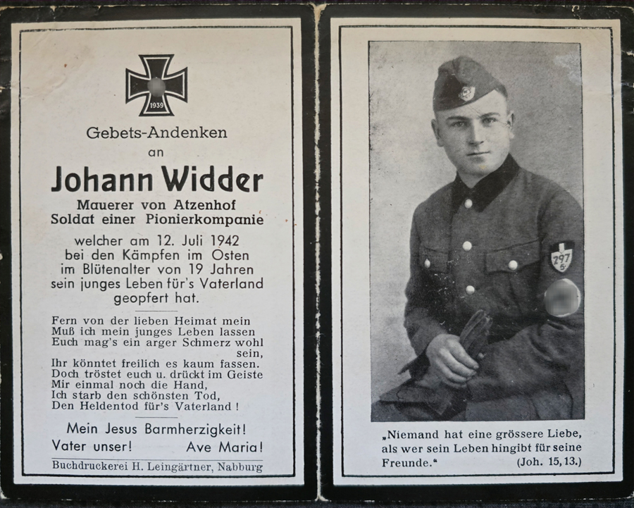 Pionier | WIDDER | Johann | 19.02.1923 Pfreimd | 12.07.1942 im Osten, Juchnow | Pionier Btl. 198, 1.Komp. | Unfall, gestorben |