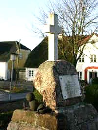 Findling (Erster Weltkrieg) auf gemauertem Sockel. Auf drei Bronzetafeln 74 Namen von Kriegstoten des Ersten Weltkrieges.