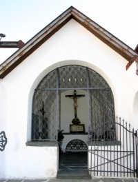 Gedächtniskapelle neben der Kirche. Über dem Altar Kruzifix, am Altar Gedenkbuch (verschlossen, nicht zugänglich), unterm Altar Nische mit Totenschädel,