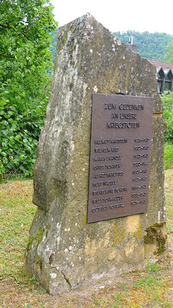 Hochkant versetzter Bankkalk-Monolith auf dem Friedhof von Unterhausen mit einer Gedenktafel auf der die