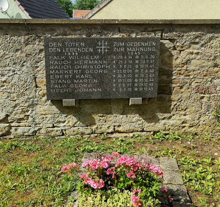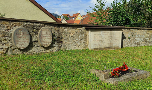 Steinerne Gedenktafeln für den Feldzug 1870/71 und beider Weltkriege an der Friedhofsmauer.