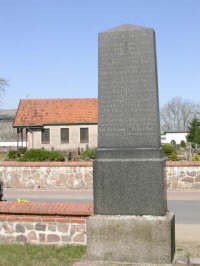 Denkmal dem Friedhof gegenüber für die Kriegstoten des Ersten Weltkrieges. Vorderseite Stahlhelm (Relief) und Inschrift, Rückseite Inschrift und Namen.