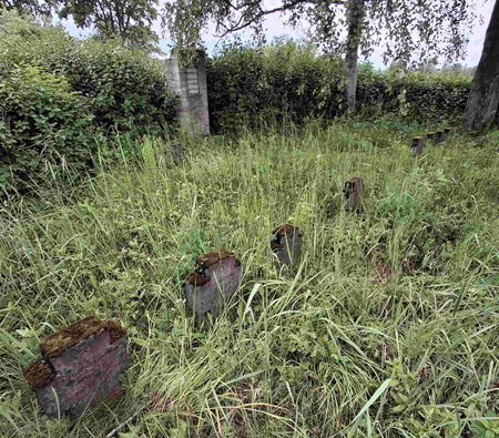 umrandet von einer dichten Hecke und einem Holztor. Der Friedhof ist stark zugewachsen.