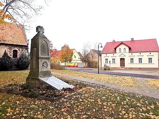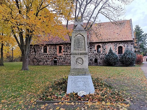 Stele für die Gefallenen beider Weltkriege vor der Kirche.
