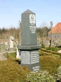 Auf dem Kirchhof der Kirche von Wilstrup ein schwarzer gestufter Obelisk mit Inschrift.