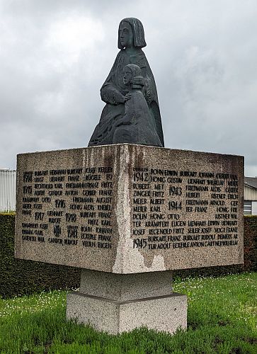 Steinkubus, arauf eine Figur Mutter mit Kind.