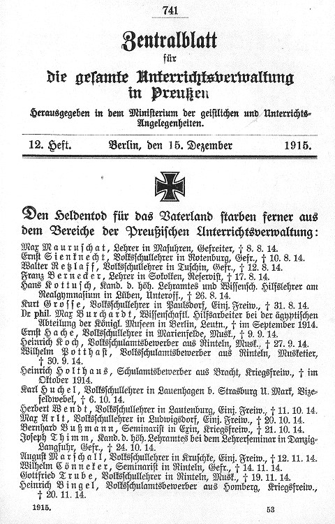 Den Heldentod für das Vaterland starben aus dem Bereich der Preußischen Unterrichtsverwaltung: