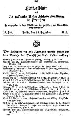Den Heldentod für das Vaterland starben aus dem Bereich der Preußischen Unterrichtsverwaltung: