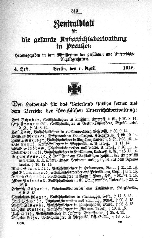 Den Heldentod für das Vaterland starben aus dem Bereich der Preußischen Unterrichtsverwaltung: