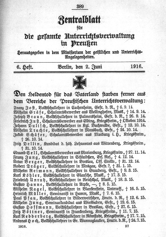 Den Heldentod für das Vaterland starben aus dem Bereich der Preußischen Unterrichtsverwaltung: