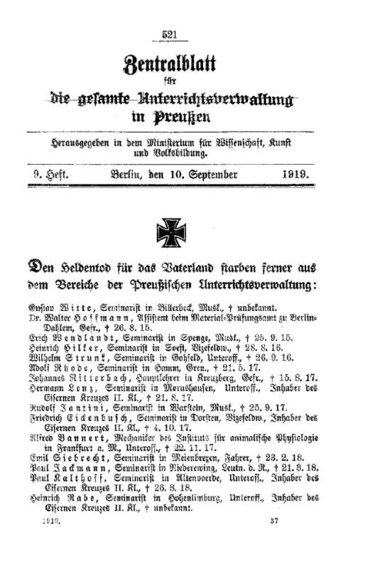 Den Heldentod für das Vaterland starben aus dem Bereich der Preußischen Unterrichtsverwaltung: