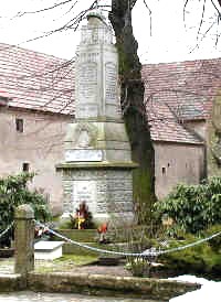 Stele aus grauem Granitstein. Vor dem Denkmal des Ersten Weltkriegs rechts und links je eine Steintafel mit den Namen der Opfer des Zweiten Weltkriegs.