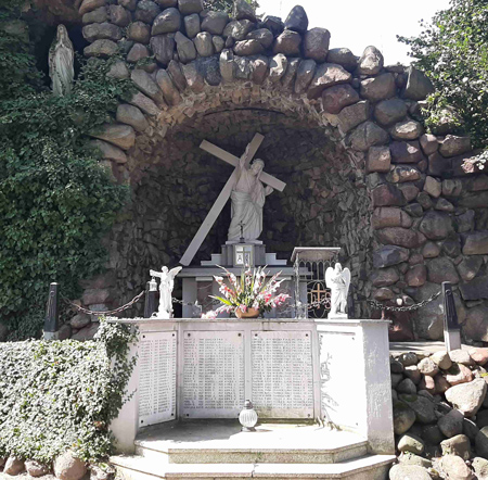 Vor einer Jesus-Grotte wurde eine abgewinkelte Wand mit weißen Namenstafeln aufgestellt (ohne Widmung).