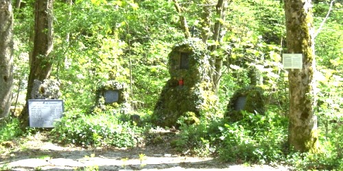 Zwei Steinblöcke mit einer Inschrift, ein Steinblock mit Marienbildnis, an einem Baum eine Tafel: