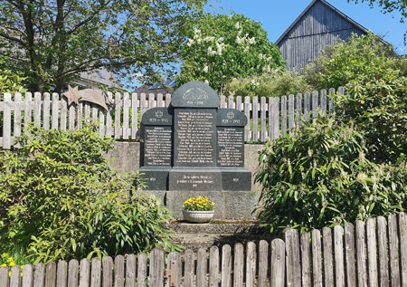 Dreiteiliges Denkmal in einer kleinen umzäunten Anlage in der Ortsmitte.