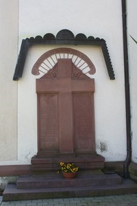 Außen an der Kirche: Marmorplatte mit integriertem Kreuz, darüber Kupferdach (Erster Weltkrieg),