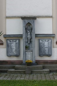 Säule mit Kruzifix und Gedenktafel, flankiert von zwei weiteren Gedenktafeln (Zweiter Weltkrieg).