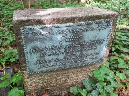 Dem Gedächtnis unseres heissgeliebten Sohnes … und in Feindesland bestattet. Er starb den Heldentod fürs Vaterland, lebt aber unvergänglich weiter im Herzen seiner tief trauernden Eltern und Aller, die ihn kannten. |