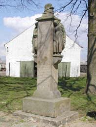 Sandsteinstele, rechts und links flankiert von einer trauernden Frauenskulptur. Oben befindet sich ein Stahlhelm auf einem Kranz aus Eichenlaub.
