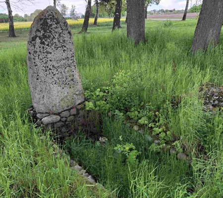 Aufgerichteter Findling mit Inschrift und Grabumrandung südlich des Ortes an der Landstraße.