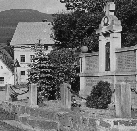 und krönendem EK-Zeichen. Das Denkmal wurde nach 1945 abgerissen. Nur einer der Blöcke mit den Namen aus