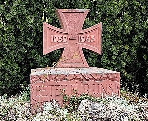2. Am oberen Rand des örtlichen Friedhofes sind an zwei Steinhaufen Steinplatten mit den Namen der Gefallenen und Vermissten beider Weltkriege schräg angeschraubt. Durch Witterungseinflüsse fehlt bei vielen Angaben jedoch die ehemals weiße Fassung, so daß diese sehr schwer lesbar sind. Den oberen Abschluß bildet jeweils ein Eisernes Kreuz aus Sandstein mit den Jahreszahlen beider Kriege.