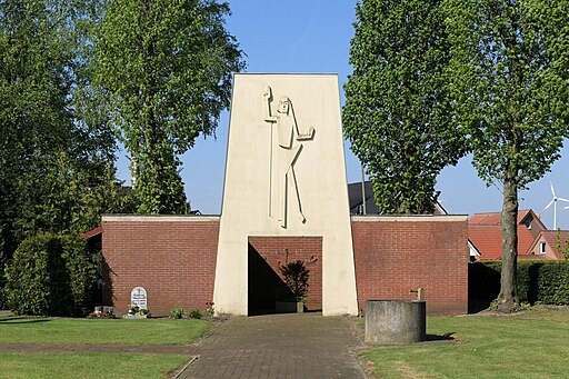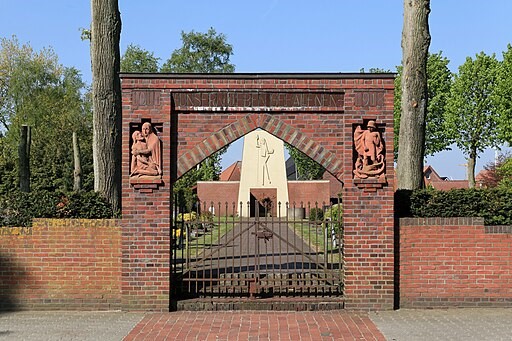 Ehrenmal auf dem Friedhof in Wippingen. Mit Haupteingangstor und einer Gedächtnishalle mit Ehrengräbern.