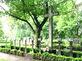 14 Kriegsgräber in einer Reihe, in der Mitte ein großes Kreuz mit Inschrift. Einige Familiengrabstätten.