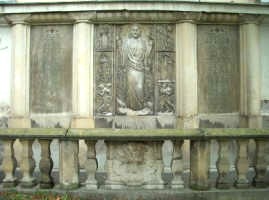 Das Denkmal befindet sich an der linken Außenwand der Kirche. Im Mittelpunkt ein aus mehreren Bildern bestehender Fries. Die Inschriften sind am Sockel angebracht.