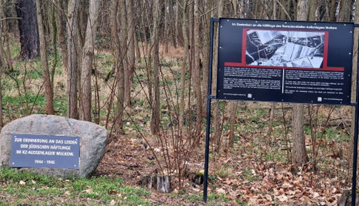 Er erinnert an ein Außenlager des KZ Theresienstadt. Am 02.03.1944 wurden über den Bahnhof Trebnitz Häftlinge heran gefahren,