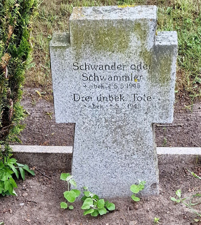 | Feldwebel | SCHWANDER | Hans | 05.05.1945 Zachow/Berg | Pz.A.O.K.3 Wehrgeolog. Station 28 | oder SCHWAMMLER, aus Köln Ehrenfeld, lt. Sterberegister Name auch SCHWANDLER oder SCHWAMBORN | |