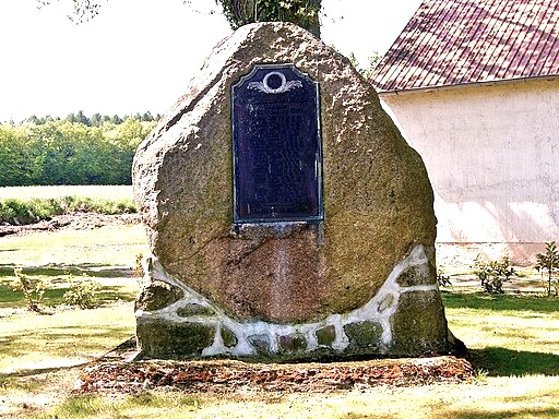 Kirchenweg, neben der Kirche: Ein Findling auf Feldsteine gemauert. Bronzetafel für die Namen des Ersten Weltkriegs.