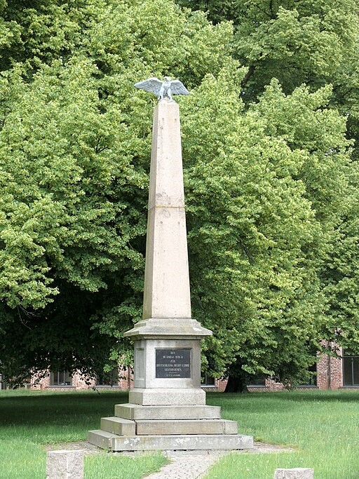 Ein Obelisk auf einem vierstufigen Podest, oben ein Adler mit ausgebreiteten Schwingen. Auf der Vorderseite des Sockels ist eine Tafel mit Inschrift eingearbeitet.