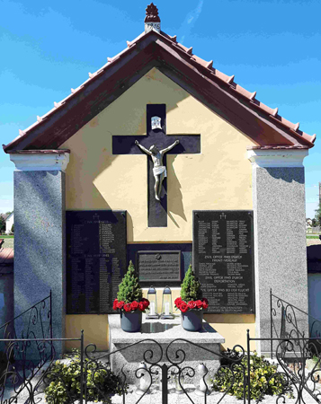 Denkmal für die Gefallenen und Zivilopfer des 1. und 2. Weltkriegs an der Friedhofsmauer.