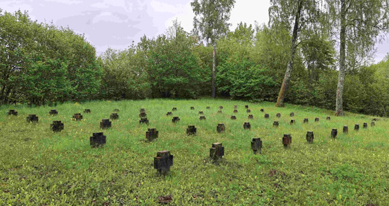 Betonstäbe im Boden markieren den Eingang, der mit einem Erdwall und alten Birken umrandeten Anlage.