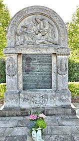 Oben, über der Gedenktafel, ist eine Sterbeszene mit Inschrift.