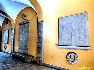 Denkmal 1914-1918 in der stadtseitigen Eingangshalle der Universität. Sechs Namenstafeln aus Kirchheimer Muschelkalk an der Wand der Eingangshalle der Universität