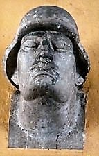 Über der mittleren Tafel ragt ein Soldatenkopf aus der Wand. Unter den kleineren Tafeln jeweils ein Lorbeerkranz aus dem gleichen Steinmaterial.