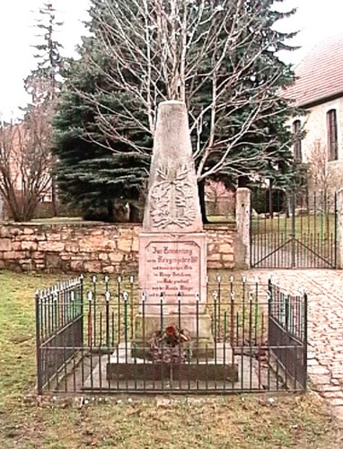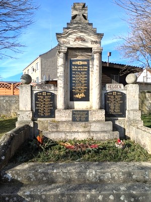 An den Fuß des Mittelteils wurde wahrscheinlich nach 1990 eine Tafel angebracht mit den Namen von zwei durch die Besatzungsmacht verschleppten Männern der Gemeinde. Das Ganze ruht auf zwei Stufen und ist von einer kleinen Mauer begrenzt, die nach vorn führt und durch den vorderen Abschluss mit einer kleinen Treppe einer Art begrüntes Beet oder Fläche für Ehrungen bildet.