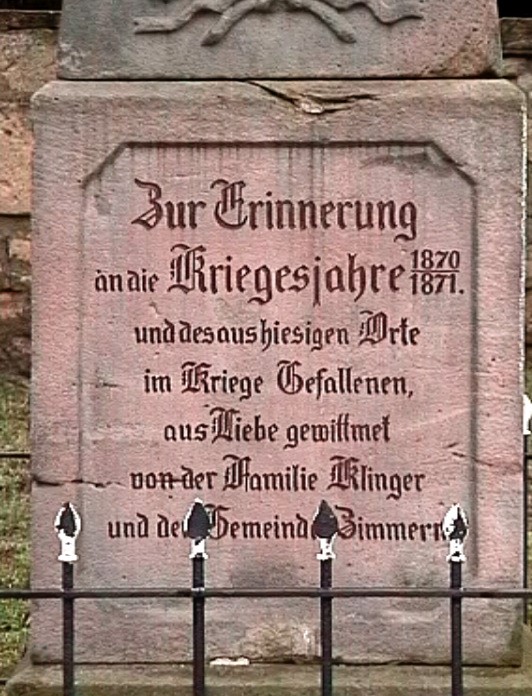 Im Bereich der Kirche in Zimmern stehen zwei Denkmale, die Kriege zum Inhalt haben. Ein großes öffentliches Mahnmal für die zwei Weltkriege und ein kleineres Denkmal, das wohl als erstes nach dem Deutsch-Französischen Krieg von privater Hand gemeinsam mit Gemeindemitteln errichtet wurde. Das geht auch aus der Inschrift hervor. Beide Denkmal wurden aus Kalksandstein errichtet. Das ältere besteht aus einem Sockel, auf diesem ein Quader mit den Inschriften und als Abschluss ein Obelisk.