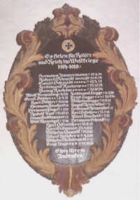Reich geschmückte ovale Wandtafel in der Kirche mit goldenem Blätterkranz und kleinem Eisernen Kreuz.